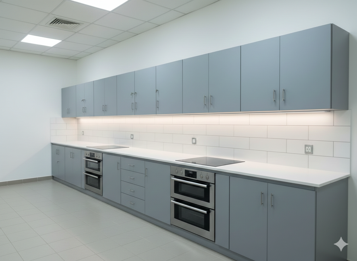 Cuisine moderne et épurée, idéale pour un environnement professionnel (comme des bureaux) ou une habitation contemporaine.
